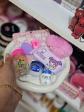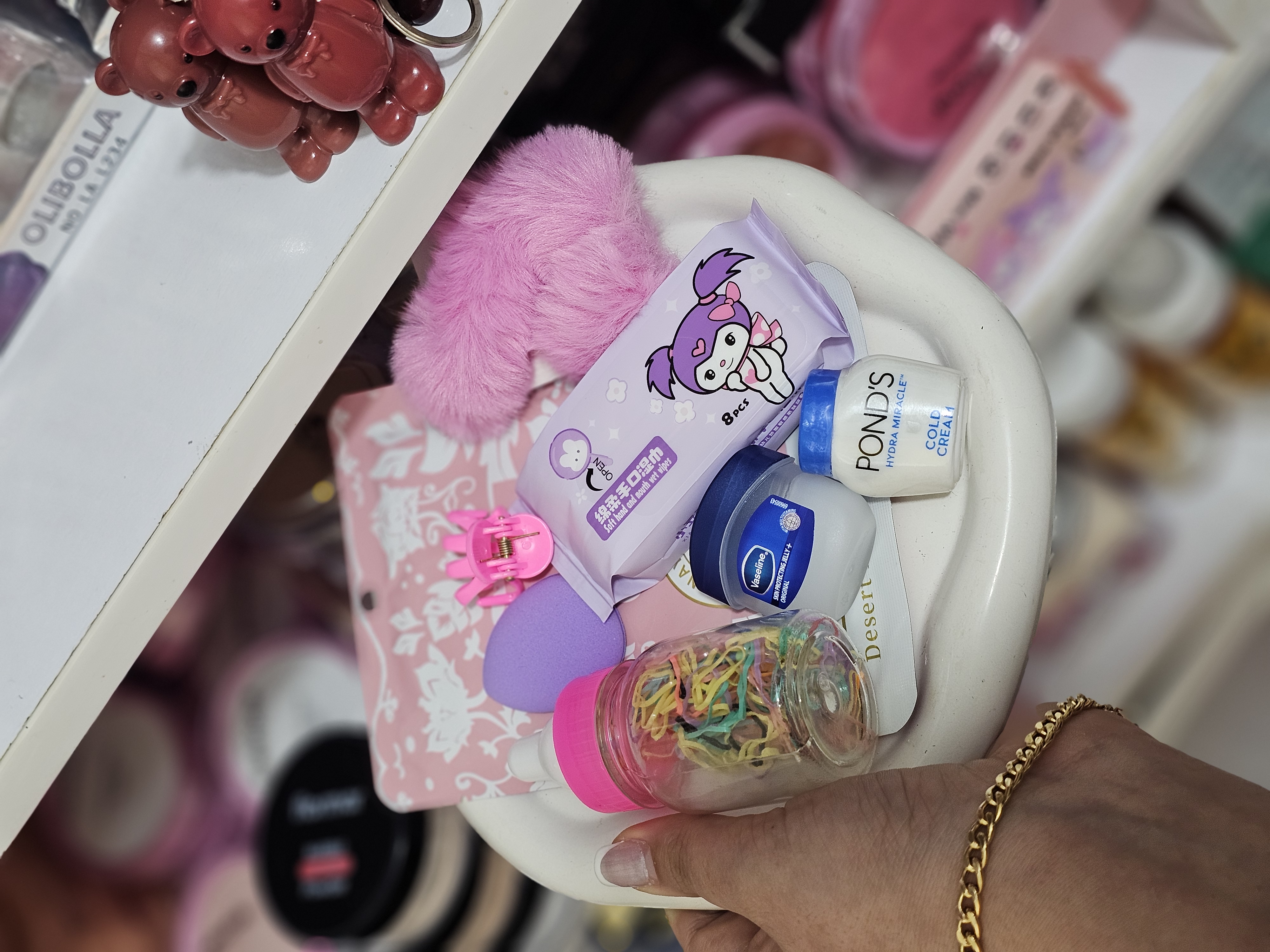 ماسک + کرم دست + بالم لب + کش مو + کش چهل گیس + گیره مو + دستمال مرطوب + پد انگشتی کانسیلر